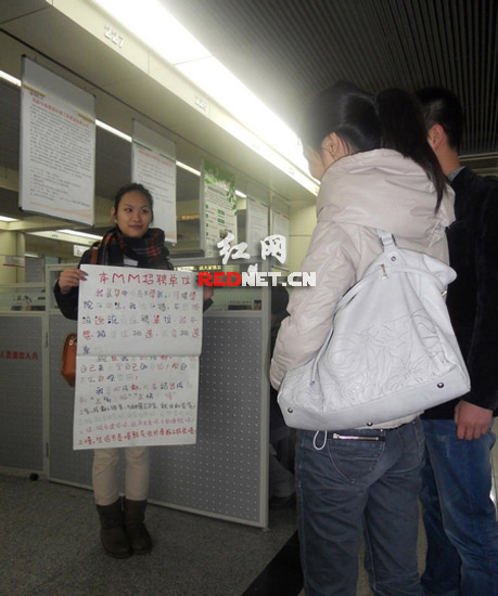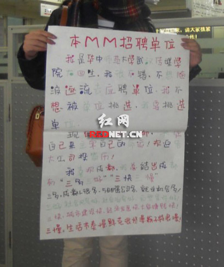 “一個(gè)長(zhǎng)相十分靚麗的女子在招聘會(huì)現(xiàn)場(chǎng)手上舉著一個(gè)海報(bào)似的東西,周圍站滿了圍觀的人!弊呓豢,發(fā)現(xiàn)該女子在海報(bào)上稱,“自己是華中師大的大四學(xué)生,覺得自己很不錯(cuò),但是不想隨波逐流,不想讓單位來(lái)挑選自己,而是想自己能掌握主動(dòng)權(quán),自己挑選單位!