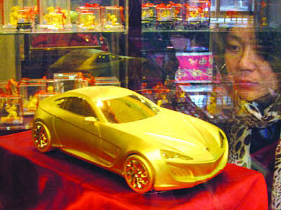 昨天,在南京寶慶銀樓舉辦的金條展上,一輛由純金打造的黃金汽車在南京首次亮相,成為當(dāng)天展會最大的亮點(diǎn),別小看它只是一個(gè)汽車模型,它可用了足足5公斤黃金,按時(shí)下的金價(jià)計(jì)算,市價(jià)值300多萬元呢,一點(diǎn)不比那些真正的跑車便宜。記者在展銷會上看到,除價(jià)值不菲的黃金跑車外,寶慶銀樓今年還推出了兔年生肖金條、記載祖宗淵源的姓氏金條等特色產(chǎn)品,重量從10克到1.5千克不等。其中,投資金條在上海金交所基礎(chǔ)金價(jià)上每克加價(jià)10元銷售,工藝金條每克加價(jià)15元。(陳春林)