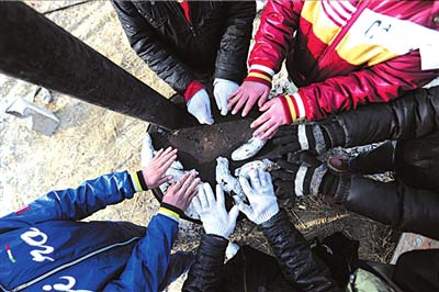 昨天中午,5名學生和1名老師來到廢墟清理物品。他們圍在一個鐵爐邊,烤了幾個紅薯解決午飯問題后,開始在廢墟中鍬挖手刨尋找被埋物品。