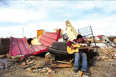 陜西學生李陽從廢墟中挖出一把吉他,試了試,還能彈。