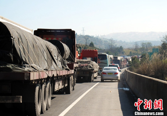 因強(qiáng)冷空氣降雪結(jié)冰給交通帶來(lái)嚴(yán)重影響,北方貨運(yùn)車(chē)輛無(wú)法南下,京港澳高速公路粵北段冰封受阻后,大量南下貨車(chē)只得滯留在湖南境內(nèi)等待高速公路解封。17日下午,南北交通全面恢復(fù),得到信息的南下貨車(chē)匆匆蜂擁而下,給剛剛恢復(fù)通行能力的道路帶來(lái)新的擁堵,先后多處出現(xiàn)長(zhǎng)達(dá)十余公里的車(chē)龍。