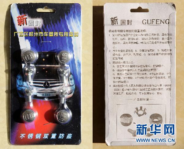 廣西柳州市交警部門日前推行新的機動車固封裝置,每個號牌的4個安裝孔均須安裝新的固封螺帽,螺帽上要壓有發(fā)牌機關(guān)代號“桂B(yǎng)”,車主需交費27元! ∫惶缀唵温菝毖b置就要27元,柳州交警部門強推的固封螺帽被網(wǎng)民怒稱為“史上最貴螺帽”!網(wǎng)友通過大量事實論證,這樣的固封裝置標(biāo)準(zhǔn)售價應(yīng)為1元一個,柳州私家車成了“唐僧肉”。新華社記者李斌攝