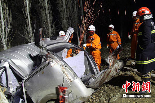圖為霍城縣消防中隊在用切割機切割殘損的車身。