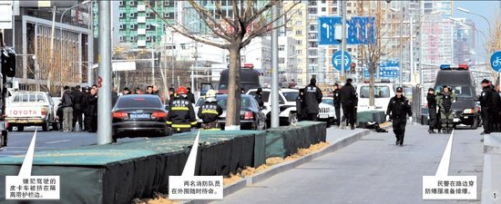 昨天上午11點(diǎn),在朝陽(yáng)區(qū)西大望路上,4輛警車前后夾擊攔下一輛白色豐田皮卡車后,司機(jī)侯某稱車上有爆炸物,警方在對(duì)峙一小時(shí)后突然砸壞車玻璃在兩秒鐘內(nèi)將侯某控制。警方透露,侯某進(jìn)京前在天津一加油站持械傷人,隨后攜帶爆炸物逃竄進(jìn)京。