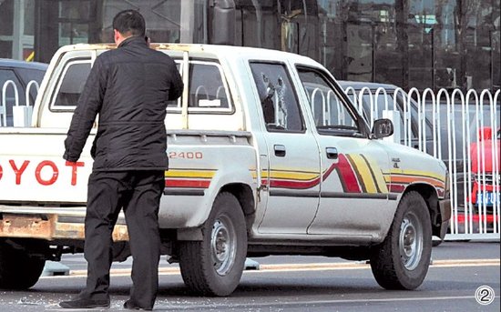 嫌犯駕駛的皮卡車右后側(cè)玻璃被民警砸成Y字形