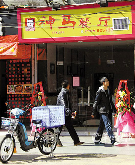 網(wǎng)絡(luò)流行語“神馬都是浮云”走進(jìn)了現(xiàn)實。26日,廣東外語外貿(mào)大學(xué)北門的叢云路上,兩個大四畢業(yè)生開的“神馬餐廳”開張,宣稱“神馬最給力?神馬餐廳最給力!”