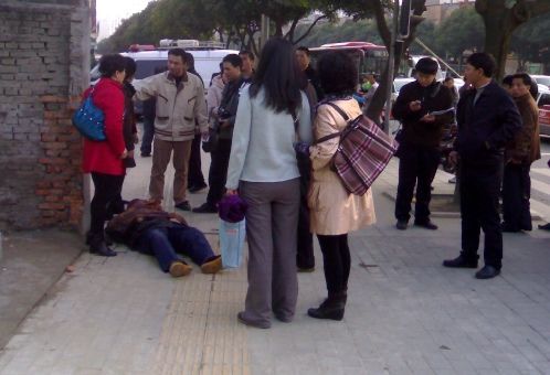 老人趴在人行道上,緊閉著雙眼,嘴角往外流著血,雙手似乎還微微顫抖著!斑活著吧”,有人這樣說道。