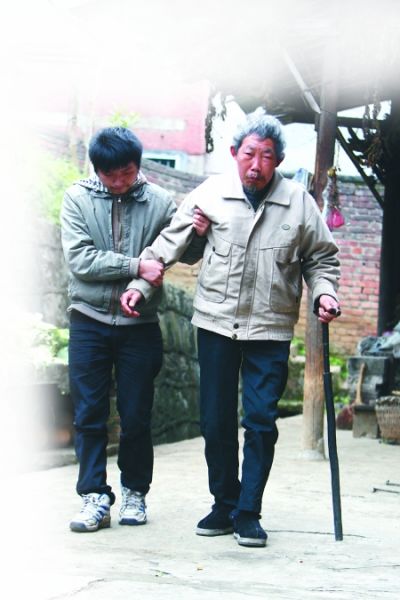 昨日,綦江縣打通鎮(zhèn),吳清亮攙扶著養(yǎng)父吳天明在院子里散步。記者 龍?jiān)谌?攝