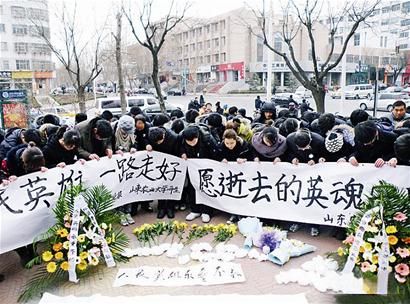 5日下午,200多名大學(xué)生和市民自發(fā)來到案發(fā)現(xiàn)場之一的文化路與龍?zhí)堵方徊媛房,將寄托哀思的條幅放在英雄犧牲的地方,并在寒風(fēng)中深深鞠躬以表哀思,F(xiàn)場的群眾默默地圍在一起,路過的市民也紛紛加入到哀悼的隊(duì)伍中!耙痪瞎蛄沂恐戮;二鞠躬,向烈士感恩;三鞠躬,烈士一路走好……”一位大學(xué)生站在最前方,帶領(lǐng)現(xiàn)場的群眾集體為烈士三鞠躬。