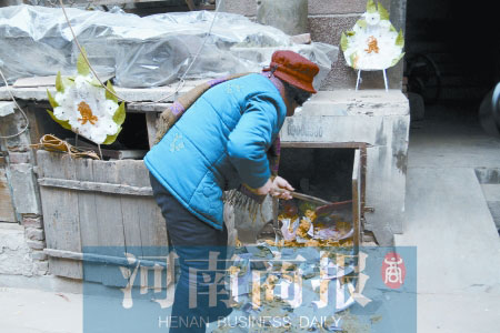 吳先生的老伴在清掃地上的冥幣(記者 趙卓/攝)
