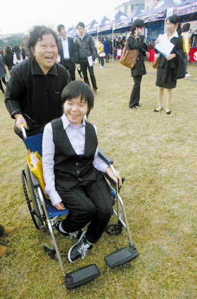 上月23日,2011屆高校畢業(yè)生招聘會(huì)從化專場(chǎng)在廣東外語(yǔ)外貿(mào)大學(xué)南國(guó)商學(xué)院舉行,F(xiàn)場(chǎng)有一名坐在輪椅上的女孩,被一位頭發(fā)花白的老太太推著,穿行在眾多穿著正裝的求職人群中,尋找適合自己的職位。