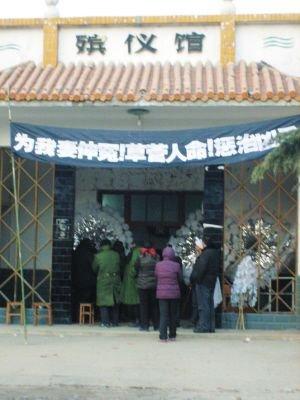 “沒有的事,我們從來就沒接受這一說法!崩罾蛏暗囊幻従訐u頭對(duì)記者說。他指著殯儀館門口懸掛的寫有“草菅人命,懲治兇手”等黑色大字的白色橫幅介紹說:“我們?cè)跉泝x館住了三四天了,就是希望能夠有一個(gè)公道的說法,希望能夠懲治兇手,告慰死者!