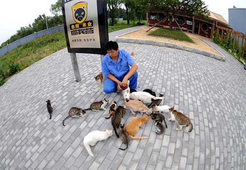記者跟著尹純柱來到“兵營”附近,只聽56歲的老尹一聲口哨,20多只各色貓兵從四處竄了出來,喉嚨里發(fā)出嬌羞的“喵喵”聲,幾只性急的貓索性躺在他身前,希望得到愛撫。