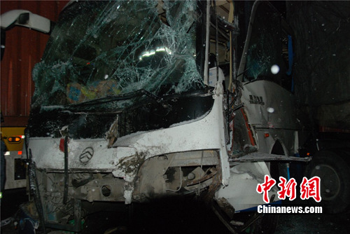 在這三輛車的附近,二輛大貨車將一輛大客車擠在了中間,三輛車并排橫在高速公路上?蛙囍虚g部位正好撞擊在集裝箱貨車尾部,現(xiàn)場物品散落一地,地上到處都血跡斑斑,客車內(nèi)有多人受傷且有40余人被困車內(nèi)。