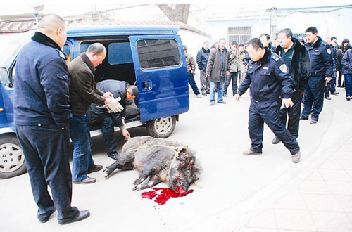 正當(dāng)人們準(zhǔn)備下手之際,這頭野豬再次發(fā)威,朝眼前的人們發(fā)動(dòng)了又一輪攻擊。人們被驚得四處躲避,野豬繞著醫(yī)院內(nèi)的通道瘋狂地飛奔起來(lái),由門診樓到花園,再由花園到停車場(chǎng),橫沖直撞。其間,醫(yī)院的上空又陸續(xù)傳來(lái)數(shù)聲槍響。最后,身中數(shù)槍、精疲力竭的野豬又一次躺在地上。