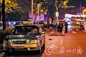 昨晚記者趕到現(xiàn)場,警方已拉上封鎖線,對現(xiàn)場進(jìn)行勘驗,并將肇事司機(jī)帶上警車。記者看到,肇事男司機(jī)中等身材,身高1.72左右。斑馬線的北邊約15米處,倒在血泊之中的林先生已被一塊大布覆蓋。在尸體北面的六七米之處,一輛車牌號為粵A694B8的綠色出租車停在路邊。記者借助路燈,卻沒看到馬路上有任何的剎車痕跡。路邊的目擊者稱,當(dāng)時的車速飛快,估計都沒剎車。