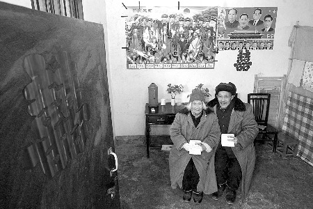 新房10平米左右,顯得干凈整潔。床上有紅色床單、紅色被子和印著喜字的大紅枕頭。潘大爺笑呵呵地把記者迎進屋里,笑容一直出現(xiàn)在他溝壑縱橫的臉上!澳憧,這就是我們的結(jié)婚證!崩先思拥啬贸鼋Y(jié)婚證,證上顯示他們結(jié)婚日期是2011年1月5日。潘大爺把鐘老太太扶到椅子上坐好后,將暖手器塞進她的懷里,對記者說:“這是我的第一個老婆,我要照顧她一輩子!崩咸捎诼犃ο陆祬柡,聽不見潘大爺?shù)脑,但從她眼眶里含著的眼淚可以看出,她很激動。