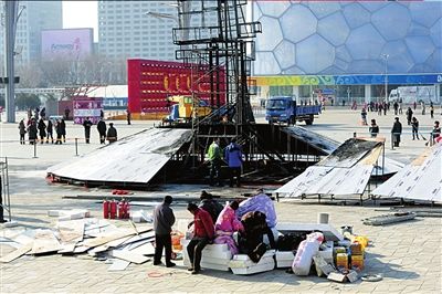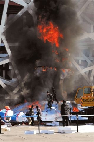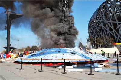 昨天中午,國家體育場西側(cè)50米處,一座正在施工中的塑料雕塑“祥云玉兔”突然起火。當(dāng)事工人稱,可能是焊接點濺出火花,引燃底座的泡沫材料,致使整體結(jié)構(gòu)起火。