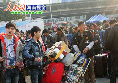 此時(shí),廣場(chǎng)上已經(jīng)聚集了許多等待進(jìn)站的旅客,為了應(yīng)付冬日早晨的嚴(yán)寒,許多人不得不在廣場(chǎng)上來回走動(dòng),甚至有的農(nóng)民工直接拿起被子在廣場(chǎng)上打起了地鋪。王勝今年十七歲,家住陜西,單薄的身軀在凜冽的寒風(fēng)中輕輕的抖著,一身單薄的衣褂被緊緊的裹在瘦弱的軀體上,王勝告訴筆者,自己昨天晚上就從東莞趕到這邊了,由于附近旅館很貴就在廣場(chǎng)上將就一晚,一陣?yán)滹L(fēng)吹過,王勝不僅打了個(gè)噴嚏。在廣場(chǎng)上等待的還有一大批剛剛從海南趕過來的大學(xué)生,由于廣東的氣溫相對(duì)于海南還要低得多,許多準(zhǔn)備不足的同學(xué)在那凍得直跺腳。