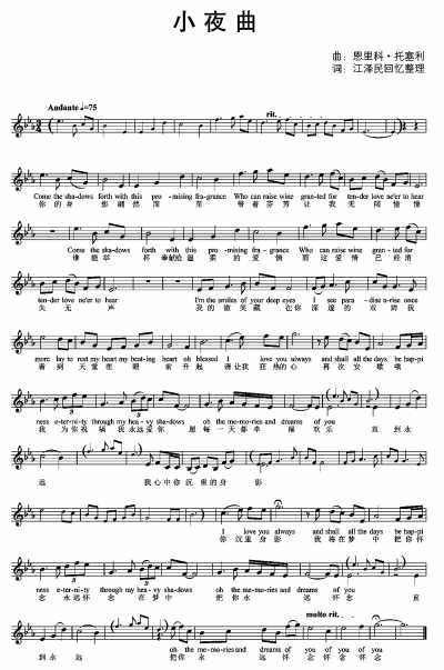 去年夏天的一天,我接到江澤民同志的電話,他問(wèn)我有沒(méi)有托塞利《小夜曲》的英文歌詞,當(dāng)時(shí)我手頭沒(méi)有,答應(yīng)幫助找一下。我通過(guò)國(guó)內(nèi)外各種渠道進(jìn)行了認(rèn)真的查找,找到兩個(gè)版本的英文歌詞,但都不是當(dāng)年在國(guó)內(nèi)流行的那個(gè)版本。江澤民同志也親自請(qǐng)幾位老音樂(lè)家?guī)椭鷮ふ,同樣沒(méi)有結(jié)果。