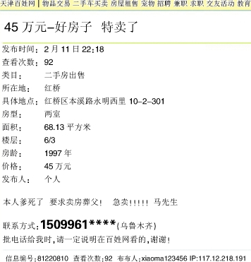 按照馬先生的介紹,記者打開“天津百姓網(wǎng)”,在二手房出售的類別中,內(nèi)容為“賣天津市紅橋區(qū)本溪路永明西里某住房,45萬元”,并注明“本人爹死了,要求賣房葬父!急賣。。!”發(fā)布人:xiaoma123456,時間:2月11日22時18分,IP地址為117.12.218.191,留的聯(lián)系方式是馬先生的手機(jī)號,并注明是烏魯木齊的手機(jī)號。