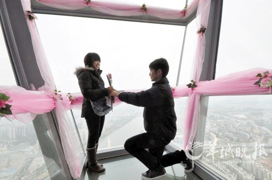 14日是情人節(jié),下午3時半,一位男士在廣州塔第107層突然掏出鉆戒,向正在俯瞰花城風光的女友求婚(圖)。