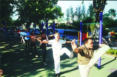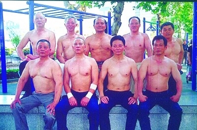 走進任師傅的家,簡直是一個家庭健身房。“因為每天都要鍛煉3個小時左右,有時候天氣不好實在不想出去,就逐漸在家里打造出很多的健身器材。”因為住一樓,院子自然成了主要場所,高高低低的雙杠、單杠就有三四組,石鎖,啞鈴等等也能放成一小排!凹依镏饕头劈c瑜伽墊子、臂力器,還有拳擊用的訓(xùn)練設(shè)備”。對擁有一個“施瓦辛格”般健壯的大力士形象是時下不少年輕男士的目標(biāo),逸仙橋卻有支平均年齡超過60歲的老年健身隊,幾乎個個練就一身健美身材。他們不僅一身肌肉,更有著各種玩單杠、雙杠的絕活,最厲害的能單手舉起80公斤石鎖。