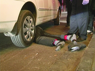 昨晨零時(shí),記者接到市民報(bào)料,反映在南京市白下區(qū)明瓦廊一飯店門口,一女子駕車時(shí),右前輪意外碾過(guò)一名橫臥街頭的男子,女子停車后發(fā)現(xiàn)男子被卡在轎車下無(wú)法動(dòng)彈,現(xiàn)在大家正在想辦法怎么把車下的人救出來(lái)。
