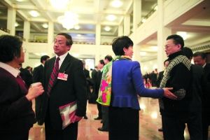 入場前,委員們在攀談。昨日下午,全國政協(xié)十一屆四次會議第四次全體會議召開。本報(bào)記者 韓萌 攝
