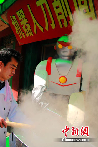 圖為12日中午,西安街頭的機器人正在“削面”。金鑫攝