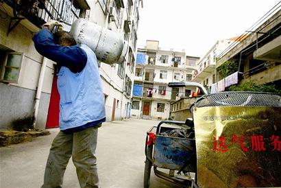 在煤氣站把幾個(gè)壇子充滿后,老肖立即騎上車掉頭給客戶送,半小時(shí)后,到了和平街的陳爹爹家。陳家在4樓,老肖把壇子搬下車后喘息了幾分鐘,“要休息好,然后一口氣搬到他家,要是中途再歇,就費(fèi)力了。”一個(gè)上午,老肖送了兩壇煤氣,賺了20元錢(qián)。