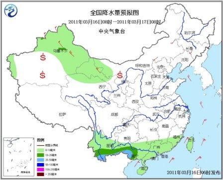 中央氣象臺今晨發(fā)布天氣預(yù)報:3月16日至18日,西南地區(qū)大部、江南、華南等地有小到中雨,其中,云南南部、廣西、廣東西北部等地的部分地區(qū)有大雨;新疆北部、青藏高原東部、內(nèi)蒙古東部、東北地區(qū)中北部等地的部分地區(qū)有小到中雪(雨)或陣雪,其中,新疆北部局地有暴雪。