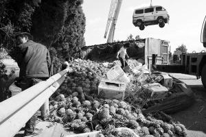 車禍中損壞的微型車被吊起,現(xiàn)場還留著大量菠蘿 高偉/攝