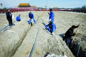 昨日,天安門(mén)廣場(chǎng),施工人員挖掘溝槽、平整土地。天安門(mén)廣場(chǎng)內(nèi)東西兩側(cè)的草坪區(qū)將首次栽種綠色灌木,并修剪成祥云圖案。