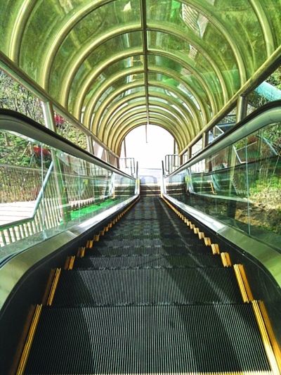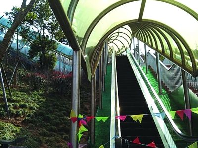 走進(jìn)園內(nèi)遠(yuǎn)遠(yuǎn)望去,在半山腰處有一段藍(lán)色彎曲的圓筒狀物,像一條龍一樣蜿蜒而上。一名學(xué)校老師告知記者那就是“翻山”電梯。走了一段路后,記者來到山腳下,發(fā)現(xiàn)電梯入口處已經(jīng)用彩旗拉起隔離帶,電梯已經(jīng)停運(yùn)。保安說電梯出了故障在檢修。記者發(fā)現(xiàn),這是一種與商場(chǎng)、超市一樣的手扶式電梯,寬約1米,為了遮風(fēng)擋雨,電梯上面的空間被封了起來,像是走廊一樣。由于電梯關(guān)閉,記者無奈步行,順著電梯旁的樓梯往上走。這是一種分級(jí)電梯,每上一級(jí)有一個(gè)平臺(tái),通過平臺(tái)后再上第二級(jí)、第三級(jí)。記者仔細(xì)數(shù)了一下,上山的電梯有3級(jí),下山的電梯有2級(jí),每一級(jí)相當(dāng)于一層樓高。從山上望下去,電梯還是有點(diǎn)陡。一圈爬完后,記者的大腿有些發(fā)抖。