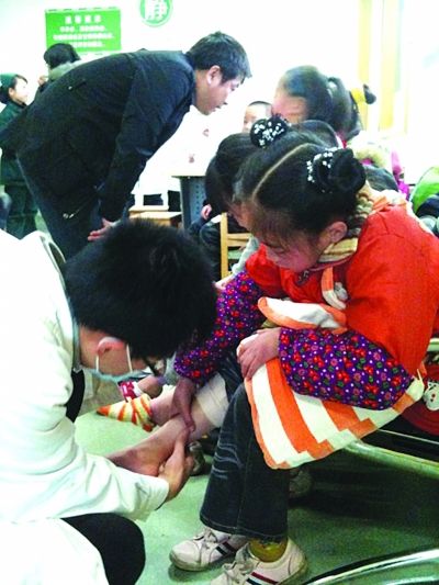 昨天中午,接到動(dòng)物園發(fā)生踩踏事故的消息后,記者在第一時(shí)間內(nèi)趕到解放軍101醫(yī)院。急診大廳內(nèi),很多穿著不同顏色校服的孩子坐在候診椅上,有的孩子腿部流血,有的孩子臉上被擦破,場(chǎng)面有點(diǎn)亂。幾名醫(yī)生蹲下身體挨個(gè)給孩子們檢查,每檢查完一個(gè)就在孩子們的褲子上貼上標(biāo)簽,上面顯示“輸液××號(hào)”。醫(yī)生告訴記者,孩子太多,他們暫時(shí)不清楚具體人數(shù),貼標(biāo)簽是為了理清人數(shù)。記者數(shù)了一下,標(biāo)簽上的數(shù)字最高為61。