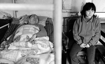 王長(zhǎng)勇躺在一張用鋼管焊接的病床上,一根導(dǎo)管從被窩里伸出,不斷將黃色的尿液排入掛在床沿上的收集袋里。這張病床,是王長(zhǎng)勇女兒的同學(xué)湊錢買的,F(xiàn)在,這位16歲的姑娘已經(jīng)輟學(xué)了,在河北一家眼鏡廠打工,掙錢養(yǎng)家。兩張床、幾把椅子、兩個(gè)柜子、一臺(tái)破舊的電視,是屋里全部的家當(dāng)。