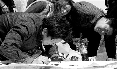 我們擠進去,只見一40多歲男子耳孔里夾著一支毛筆正在白紙上寫字,雙眼卻看著一側(cè)的雪松。