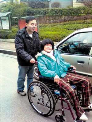 “4、3、2、1,踩到平地了!惫媚锎鲿熍吭谛』镒雍诒成,一級(jí)級(jí)地?cái)?shù)著臺(tái)階,好讓他不致踩空摔倒。到了一樓,胡磊摸索著,熟練地展開(kāi)彈簧輪椅,將背上的戴暉小心翼翼放在輪椅上。