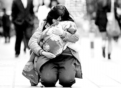照片說明:謝三秀抱著女兒在公眾的注視下跪地前行。在許多人眼中,炒作“跪行救女”,是對公眾善意的一種傷害。(資料照片)