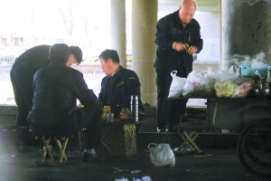接連三天,記者躲在這片小有名氣的“三輪車餐館”聚集地的周邊觀察,并就餐兩次。這里位于菜戶營橋南約500米的西鐵匠營橋下,幾近干涸的蓮花河從橋下橫穿而過。河道兩岸分散著五六輛三輪車,分屬于五六個(gè)“老板”。每輛車的四周放置了幾個(gè)竹筐,上面搭層木板,用做桌子,桌邊有小馬扎。