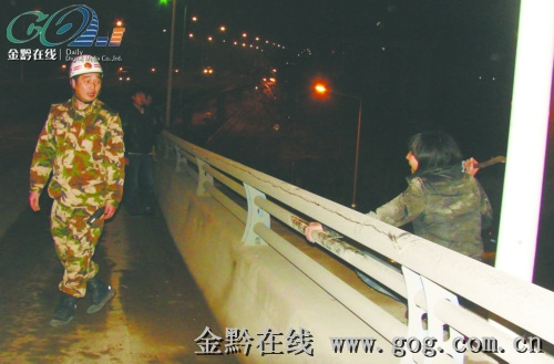 “不要過來,誰敢過來我就跳下去,反正我也不想活了!”這名女子情緒激動,邊揮舞手中木棍,邊大聲叫嚷。幾名過路的市民發(fā)現女子神情不對,想要靠近她,勸她離開橋沿,卻遭到了女子的強烈抵觸,誰也不敢再上前刺激她。隨后,有人撥打電話報警求援。一會兒,民警和貴陽市消防特勤一中隊的官兵趕到了現場。