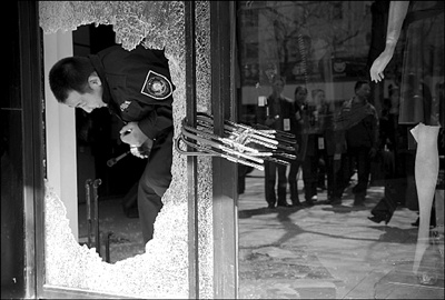 昨天上午,記者在被砸的一家女裝店門前看到,鋼化玻璃門被砸出一個大窟窿,但門上4把鎖未被撬開,門前還留有幾塊碎裂的磚頭,地面上布滿了鋼化玻璃碎片。為了保護現(xiàn)場,店內工作人員從被砸出的窟窿進出。其余3家店則均只上了一把鎖,全被撬壞。據(jù)了解,4家店丟失的財物包括一臺價值3000多元的數(shù)碼相機和5000多元現(xiàn)金。
