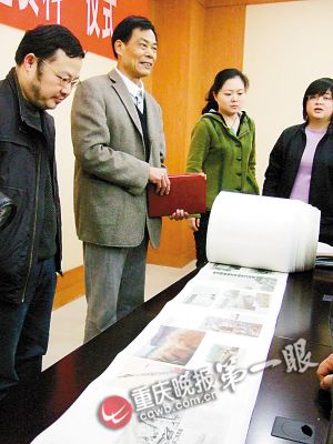 昨日上午10點(diǎn),三峽博物館接待室,宋文夏老人親自操刀,剪開方形包裝紙,露出一卷直徑半米的長(zhǎng)卷。“三峽工程相關(guān)報(bào)道資料長(zhǎng)卷寬30厘米、長(zhǎng)120米,搜集了上萬幅各大媒體圖片報(bào)道。”宋先生介紹。