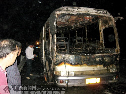 當(dāng)晚10時許,記者在現(xiàn)場看到,一輛由南寧開往武鳴的客車,燒得只剩下骨架(如圖),一輛事故清障車正在待命拖車,七八名市民站在客車旁議論紛紛。記者手持手電筒繞該輛客車走了一圈,發(fā)現(xiàn)客車的4個后輪只剩下鋼轱轆,發(fā)動機處還散發(fā)出刺鼻的塑料焦味。