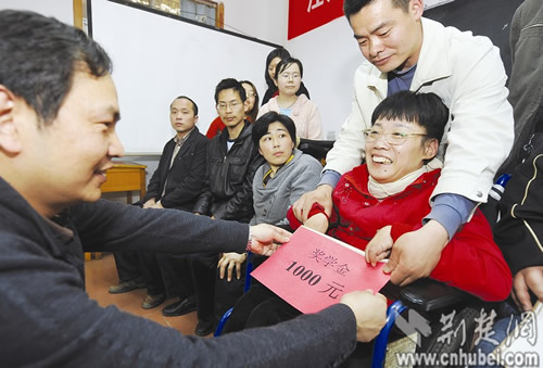 昨日,中央電大武漢分校舉行一場隆重而簡樸的儀式。該校校長為莊美鳳頒發(fā)“中央電大IET-陽光獎學金”,以表彰她頑強的奮斗精神。