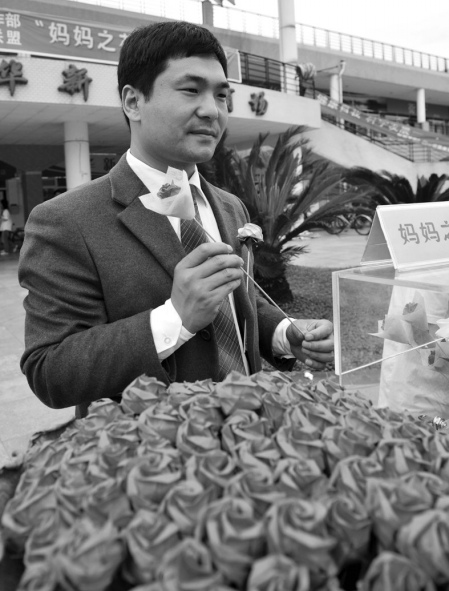 2009年5月10日,劉猛義賣“媽媽之花”(資料圖片 來源:華西都市報(bào))