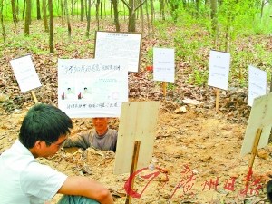 在沙井街道和一鴻江工業(yè)區(qū)對面的綠化帶上,只見一中年男子被土齊胸掩埋,舉著“生不如死”等字樣的牌子。一青年男子坐在坑邊,旁邊撲著一中年女人。中年男子告訴記者,他名叫胡顯柱,湖南新田縣人,今年45歲,膝下兩個(gè)兒子。他本人于1997年來深圳打工,現(xiàn)全家人均在寶安打工。