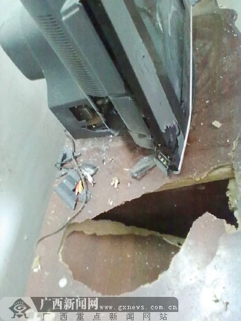 爆炸發(fā)生后,電視機(jī)和電視機(jī)柜都出現(xiàn)了大洞。