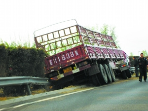 事發(fā)地點位于京承高速出京方向10公里處黃港路段。肇事車輛是一輛“蒙”字牌照的大貨車。大貨車拉了滿滿一車鋼筋盤條,因為一頭“騎上”了隔離帶,車頭和車身幾乎被“解體”,左側車廂廂壁被鋼筋盤條撞開,十余捆鋼筋盤條散落在反方向的路面上,占據(jù)了兩條車道。